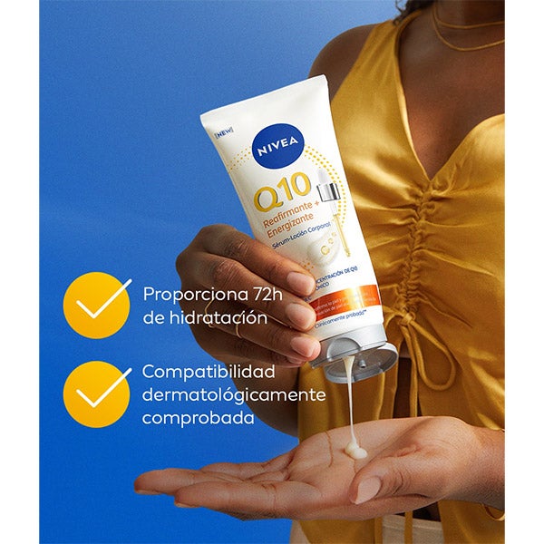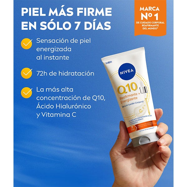 NOVO NIVEA Q10 Sérum-Loção Corporal Reafirmante e Energizante com a mais alta concentração de Q10*, ácido hialurônico e vitamina C. Reafirma a pele em apenas 7 dias e proporciona uma sensação de pele energizada instantaneamente. Além disso, sua nova fórmula leve em sérum-loção se funde suavemente com a pele e aumenta o nível de oxigênio das células da pele em até 50% após 24 horas para favorecer sua produção de energia***. E, proporciona uma hidratação profunda**** durante 72 horas - clinicamente comprovado. Resultado: pele firme, bonita e de aspecto saudável com um brilho radiante. Dentro do sortimento Corporal da NIVEA *Compatibilidade com a pele dermatologicamente testada ***Testado in vitro. ****camada superior da epiderme. Aplicar o sérum-loção por todo o corpo com uma suave massagem até sua completa absorção. Reafirma a pele em apenas 7 dias. Proporciona uma sensação de pele energizada instantaneamente