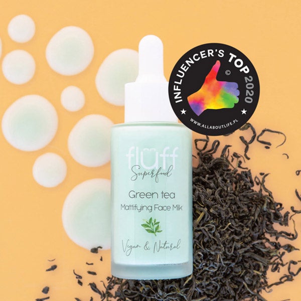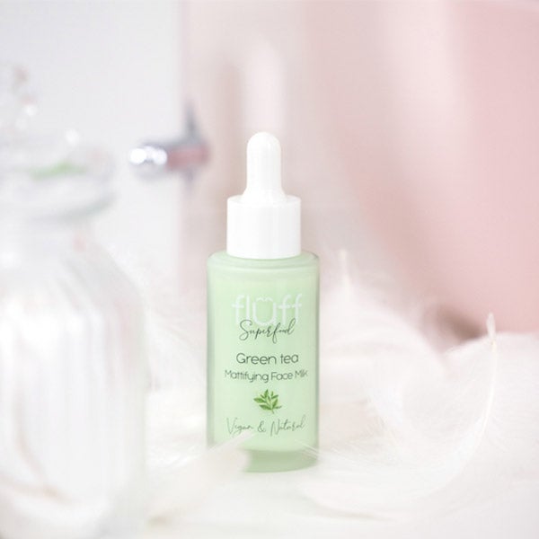 Leite facial matificante e hidratante com extrato calmante de chá verde.