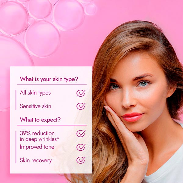 Adequado para todos os sinais de envelhecimento: falta de elasticidade, rugas e tom de pele desigual.