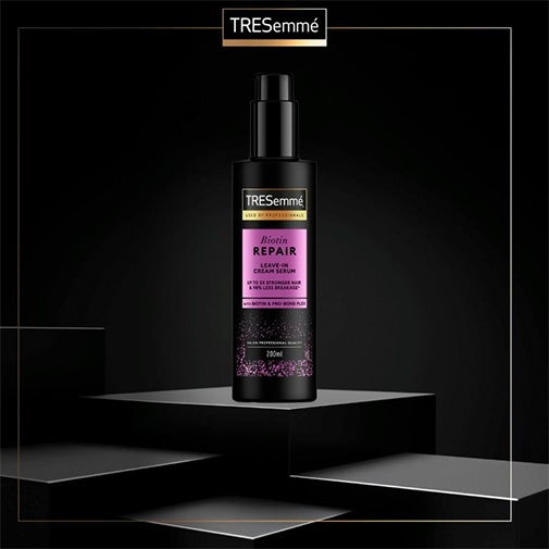Nosso novo TRESemmé Sérum sem enxágue inspirado nos salões de beleza, formulado com biotina e Pro Bond Plex, é projetado para penetrar nas fibras capilares e ajudar a reparar as ligações com o uso contínuo** em cabelos secos ou danificados, reduzindo a quebra* e protegendo o cabelo dos danos externos*.