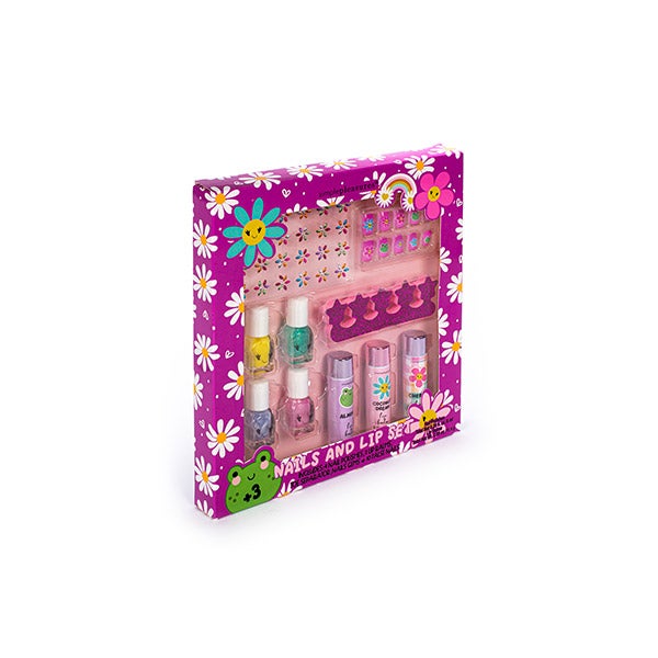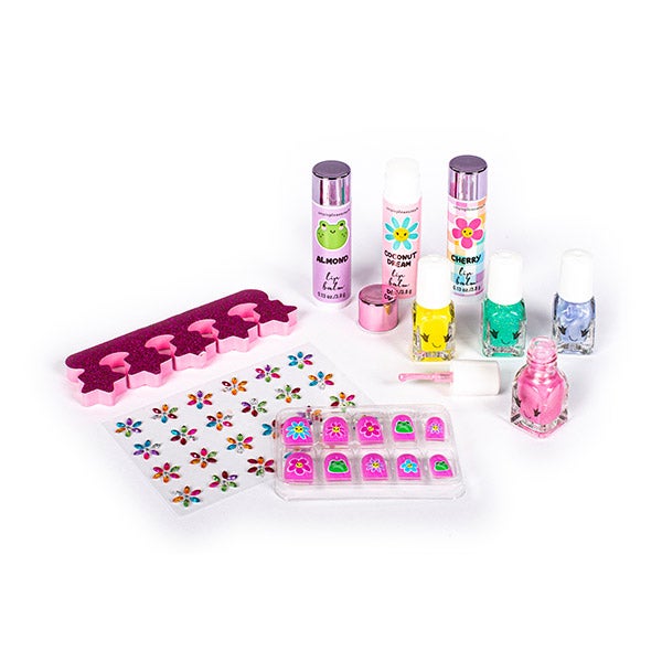 Inclui quatro esmaltes com cores de verão, separador de dedos, três bálsamos labiais, unhas postiças e adesivos para unhas.