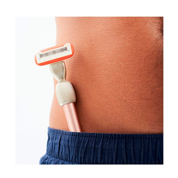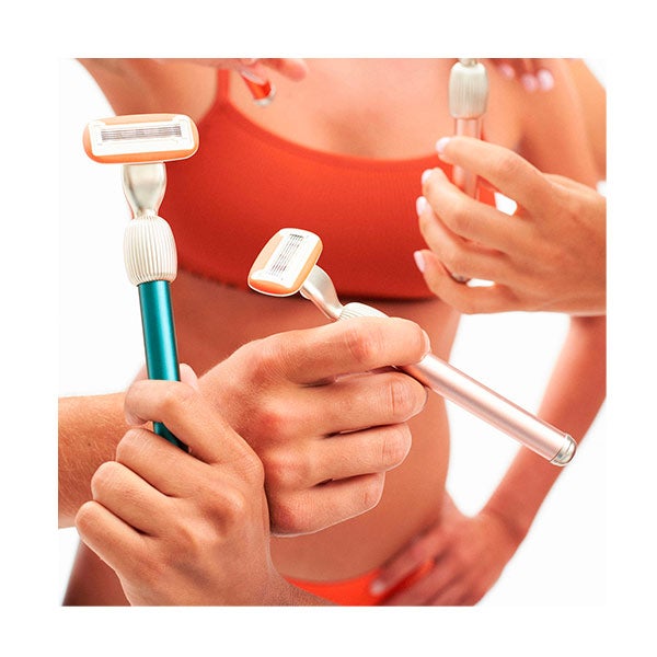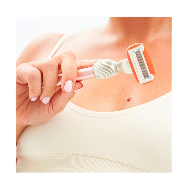 Umedeça o cabeçote da lâmina de barbear em água para ativar o anel lubrificante e passe-o sobre a área interessada para proceder à depilação.