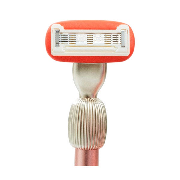 Lâmina de barbear em alumínio com 2 cabeçotes de 5 lâminas e um suporte para a parede.