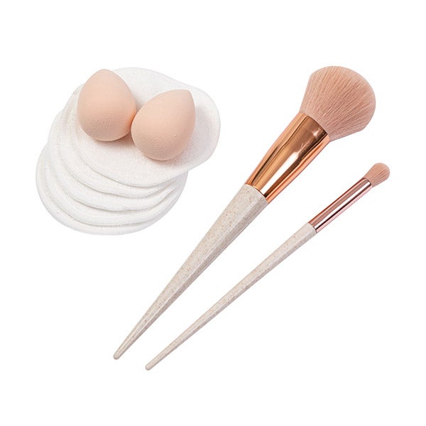 O conjunto contém: 1 pincel facial, 1 pincel para sombra, 2 esponjas para aplicar maquiagem e corretivo e 5 discos demaquilantes reutilizáveis.