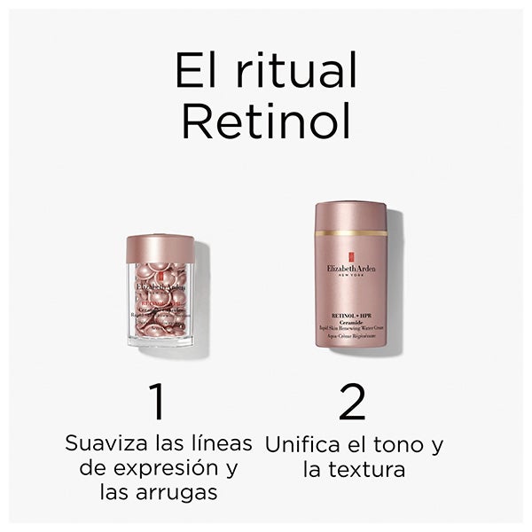 Retinol + HPR Crema Renovadora con Retinol Ceramide Water Cream: Aqua/Water/Eau, Caprylic/Capric Triglyceride, Glycerin, Diisopropyl Adipate, Pentylene Glycol, Dimethicone, Butylene Glycol, 4-t-Butylcyclohexanol, 1,2-Hexanediol, Acetyl Tetrapeptide-11, Acetyl Tetrapeptide-9, Ammonium Acryloyldimethyltaurate/Beheneth-25 Methacrylate Crosspolymer, Bisabolol, Butyrospermum Parkii (Shea) Butter, C13-14 Isoalkane, Caprylhydroxamic Acid, Carbomer, Ceramide NP, Cetearyl Dimethicone Crosspolymer, Dimethyl Isosorbide, Disodium EDTA, Glyceryl Stearate, Glycine Soja (Soybean) Oil, Hydroxypinacolone Retinoate, Laureth-7, Limnanthes Alba (Meadowfoam) Seed Oil, Macadamia Integrifolia Seed Oil, Mica, Moringa Oleifera Seed Oil, PEG-100 Stearate, Phytosphingosine, Polyacrylamide, Polysorbate 20, Retinol, Sodium Hyaluronate, Tromethamine, Zingiber Officinale (Ginger) Root Extract, Parfum (Fragrance), Tocopherol, Iron Oxides (CI 77491). B02751 - Retinol + HPR Ceramide Capsules Sérum Alisador de Arrugas: Cyclopentasiloxane, Dimethicone, C12-15 Alkyl Benzoate, Vinyl Dimethicone/Methicone Silsesquioxane Crosspolymer, Diisopropyl Adipate, Dimethicone/Vinyl Dimethicone Crosspolymer, Dimethicone Crosspolymer, Bisabolol, Butyrospermum Parkii (Shea) Butter, C18-36 Acid Glycol Ester, C18-36 Acid Triglyceride, Ceramide NP, Colloidal Oatmeal, Farnesol, Glycine Soja (Soybean) Oil, Hydroxypinacolone Retinoate, Limnanthes Alba (Meadowfoam) Seed Oil, Macadamia Integrifolia Seed Oil, Moringa Oleifera Seed Oil, Palmitoyl Tetrapeptide-7, Palmitoyl Tripeptide-1, Phytosphingosine, Retinol, Silica silylate, Sorbitan Laurate, Tocopheryl Acetate. B02856
