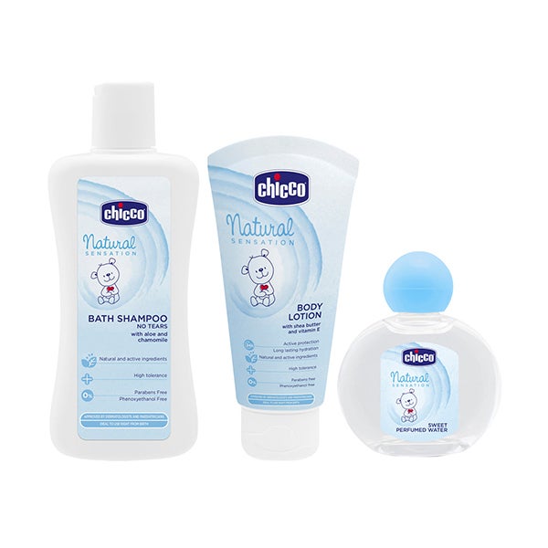 O kit de início Natural Sensation inclui produtos básicos para a higiene do bebê. Todos eles com ingredientes naturais, alta tolerância testada e o agradável aroma da cosmética Chicco. Ideal como presente.