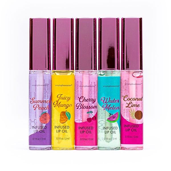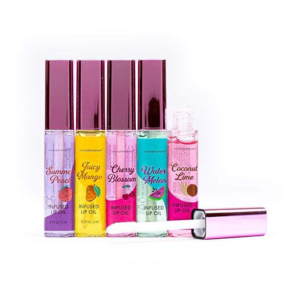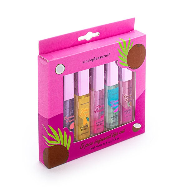 Conjunto de 5 óleos labiais com sabor a frutas, que hidratam seus lábios profundamente.