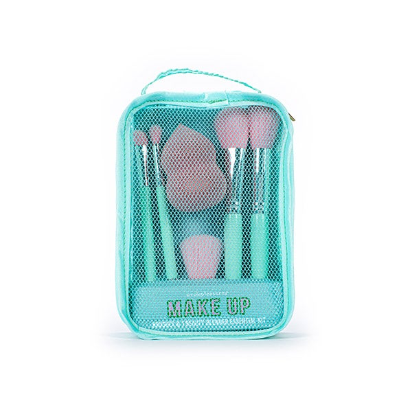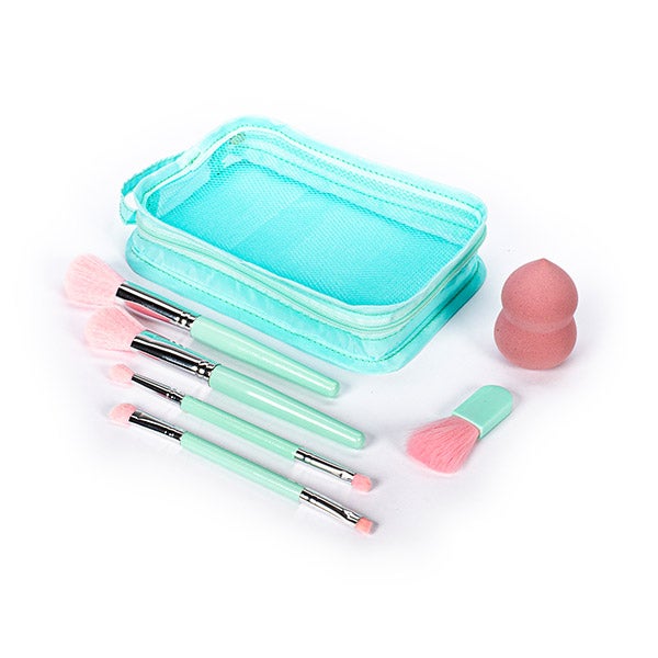 Conjunto que inclui cinco pincéis de maquiagem, uma esponja de maquiagem e uma nécessaire ideal para levar seus essenciais em todas as suas viagens.