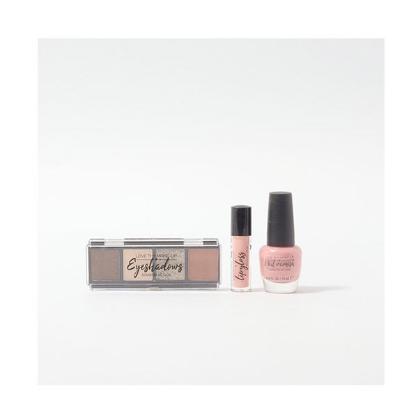 Contém uma paleta de sombras, um esmalte rosinha e um brilho labial que fica bem em qualquer tom de pele.