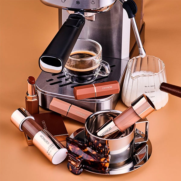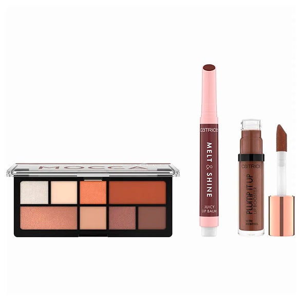 O conjunto Catrice multi mix inclui três bestsellers em tons marrons: The Hot Mocca Eyeshadow Palette, The Melt & Shine Juicy Lip Balm 100 Sunny Side Up e The Plump It Up Lip Booster 100 Work It, Twerk It.