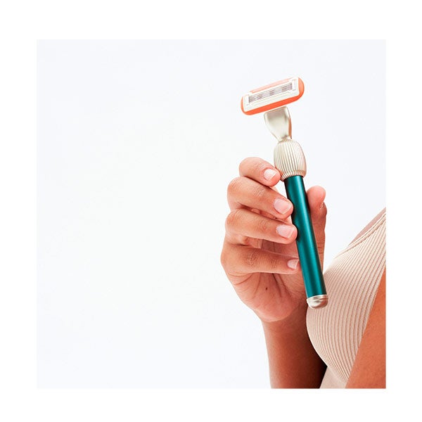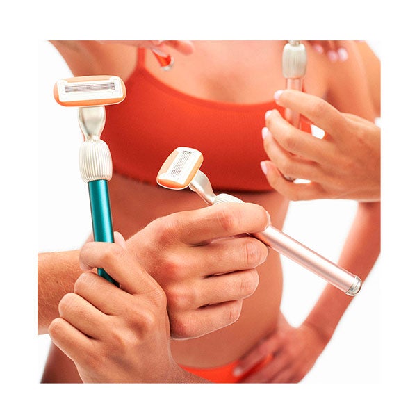 Umedeça o cabeçal da lâmina de barbear em água para ativar o anel lubrificante e passe-o sobre a área interessada para proceder à depilação.