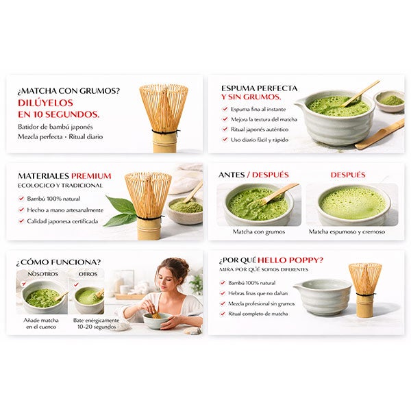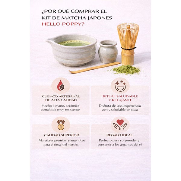 O Conjunto Ritual de Matcha Hello Poppy Tudo o que você precisa para preparar matcha como um profissional. Combina design artesanal, materiais naturais e os utensílios essenciais para conseguir uma textura cremosa, sem grumos e com o sabor autêntico do matcha cerimonial.