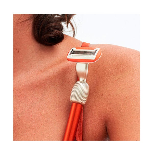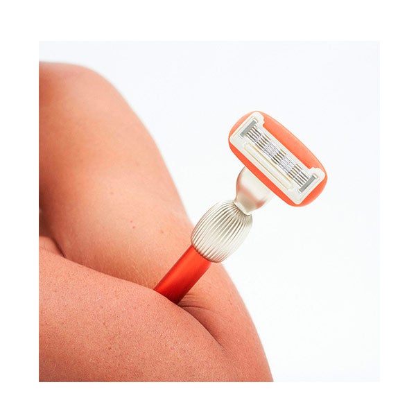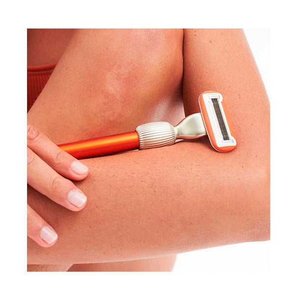Umedeça o cabeçote da lâmina de barbear em água para ativar o anel lubrificante e passe-o sobre a área interessada para proceder à depilação.