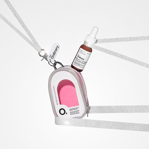 Uma solução multiactiva projetada para reparar a barreira cutânea, acalmar o desconforto e reduzir a vermelhidão em uma nécessaire com chaveiro reutilizável de presente.