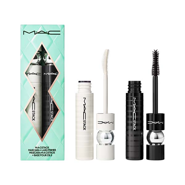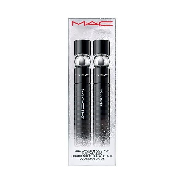 Leve suas pestanas ao infinito com este duo de edição limitada de M·A·CStack Mascara e M·A·CStack Micro Mini pronto para presentear em uma embalagem cromada brilhante e branca como neve exclusiva para as festas.