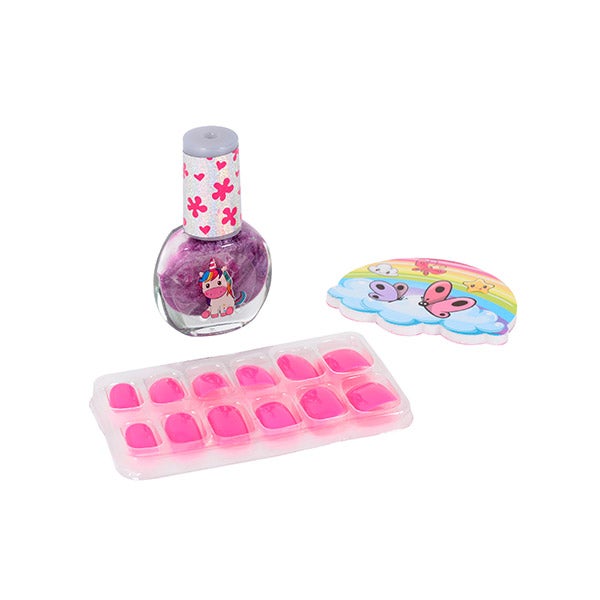 Contém um pacote completo de unhas postiças e um esmalte de purpurina para fazer suas manicures mais incríveis