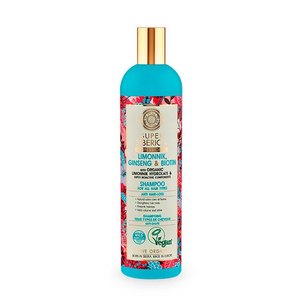 O shampoo profissional schizandra, ginseng e biotina, baseado em hidrolato de schizandra orgânico, ativa o crescimento do cabelo e o deixa mais grosso e brilhante.