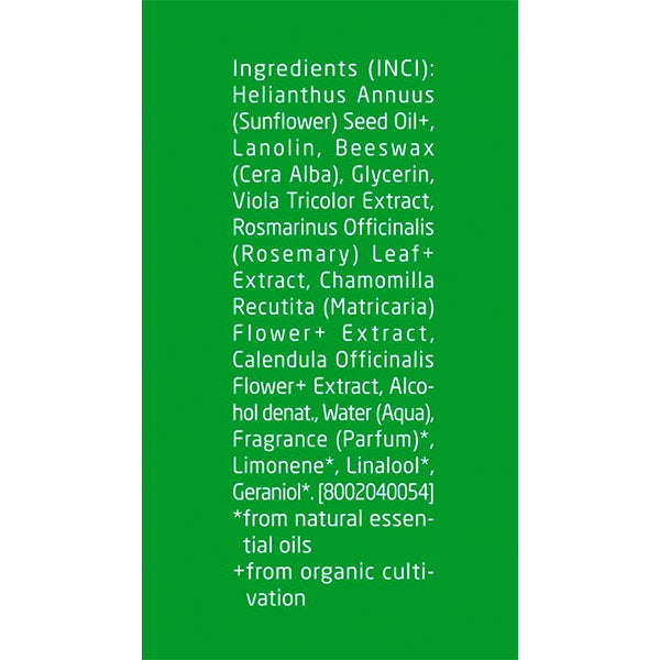Helianthus Annuus (Sunflower) Seed Oil⁺, Theobroma Cacao (Cocoa) Seed Butter⁺, Euphorbia Cerifera (Candelilla) Wax, Glycerin, Rosmarinus Officinalis (Rosemary) Leaf Extract, Chamomilla Recutita (Matricaria) Flower⁺ Extract, Calendula Officinalis Flower⁺ Extract, Viola Tricolor Extract, Alcohol denat., Water (Aqua), Pentylene Glycol, Fragrance (Parfum), Benzyl Alcohol, Beta-Caryophyllene, Citrus Aurantium Flower Oil, Citrus Aurantium Peel Oil, Lavandula Oil/ Extract, Limonene, Linalool, Linalyl Acetate, Pinene, Terpineol.