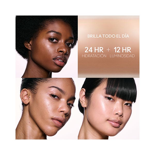 Proporciona 24 horas de hidratação e 12 horas de luminosidade para um efeito de pele de vidro que dura... e dura. Os nove tons flexíveis e fluidos são ativados graças a uma brilhante mistura complexa de pigmentos radiantes e partículas nacaradas que alcançam o equilíbrio perfeito entre brilho, opacidade e cor difusa.