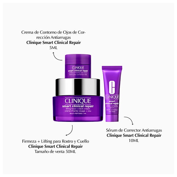 Crema Clinique Smart Clinical Repair™ Firmeza + Lifting para Rostro y Cuello: Water Aqua Eau, Butyrospermum Parkii (shea) Butter, Butylene Glycol, Caprylic/capric/myristic/stearic Triglyceride, Polyglyceryl-3 Methylglucose Distearate, Glycerin, Coco-caprylate/caprate, Simmondsia Chinensis (jojoba) Seed Oil, Polyglyceryl-10 Pentastearate, Glyceryl Stearate, Behenyl Alcohol, Ricinus Communis (castor) Seed Oil, Mangifera Indica (mango) Seed Butter, Prunus Amygdalus Dulcis (sweet Almond) Seed Extract, Caffeine, Dimethicone, Ethylhexylglycerin, Dimethicone/vinyl Dimethicone Crosspolymer, Caprylyl Glycol, Beeswax Cera Alba Cire D'abeille, Sodium Hyaluronate, Acetyl Hexapeptide-8, Palmitoyl Tripeptide-1, Palmitoyl Tetrapeptide-7, Palmitoyl Hexapeptide-12, Peg-8, Peg-100 Stearate, Glyceryl Polymethacrylate, Acrylates/va Copolymer, Copernicia Cerifera (carnauba) Wax Copernicia Cerifera Cera Cire De Carnauba, Potassium Cetyl Phosphate, Acrylates/c10-30 Alkyl Acrylate Crosspolymer, Sodium Stearoyl Lactylate, Hydroxyethyl Acrylate/sodium Acryloyldimethyl Taurate Copolymer, Stearic Acid, Hexylene Glycol, Sodium Hydroxide, Carbomer, Polysorbate 60, Sorbitan Isostearate, Polysorbate 20, Tocopheryl Acetate, Tocopherol, Disodium Edta, Phenoxyethanol, Chlorphenesin, Potassium Sorbate, Mica, Titanium Dioxide (ci 77891) <ILN51159>. Clinique Smart Clinical Repair™ Crema de Contorno de Ojos de Corrección Antiarrugas: Ingredientes clave