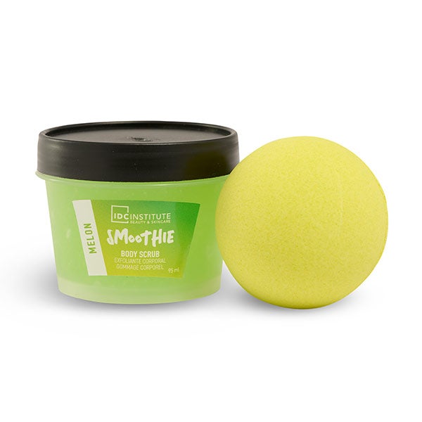 Conjunto de banho com aroma de melão que inclui uma bomba de banho e um esfoliante corporal.