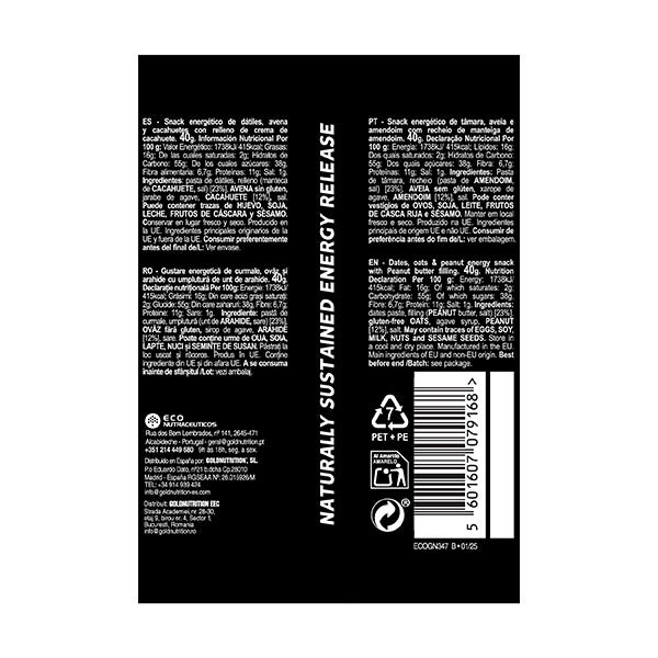 pasta de dátiles, relleno (manteca de cacahuete, sal) [23%], avena sin gluten, jarabe de agave, cacahuete [12%], sal. Puede contener trazas de huevo, soja, leche, frutos de cáscara y sésamo