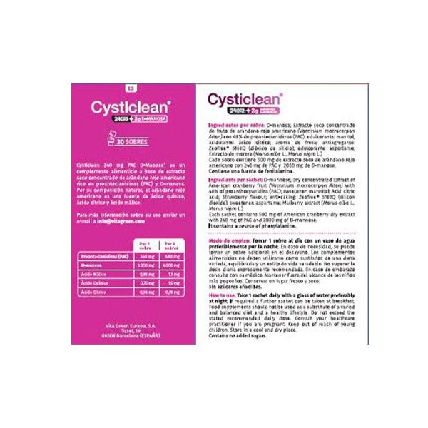 Ingrediente por sobre: D-manosa; Extracto seco concentrado de fruto de arándono rojo americano (Vaccinium macrocarpon Aiton) con 48% de proantocianidinas (PAC); edulcorante: manitol; acidulante: ácido cítrico; aroma de fresa, antiagregante: Zeofree 5162Q (dióxido de silicio);®edulcorante: aspartamo; Extracto de morera (Morus alba L., Morus nigra L.).
