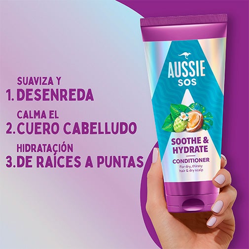O condicionador Aussie SOS Soothe & Hydrate será sua salvação. Enriquecido com superalimentos australianos, este condicionador desembaraçante hidrata e acalma seu couro cabeludo enquanto nutre o cabelo, deixando-o macio, liso e brilhante da raiz às pontas. Tchau! Para obter os melhores resultados, use-o junto com outros produtos da linha de cuidado capilar Aussie SOS Soothe & Hydrate