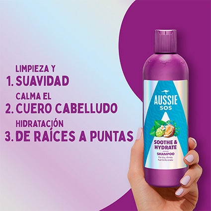 O shampoo Aussie SOS Soothe & Hydrate será sua salvação. Enriquecido com superalimentos australianos, este shampoo delicado hidrata e acalma seu couro cabeludo enquanto nutre o cabelo, deixando-o macio, liso e brilhante da raiz às pontas.