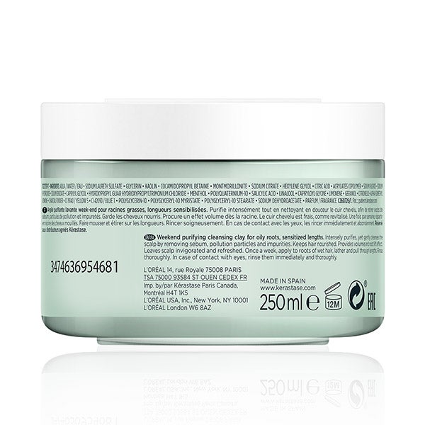 Argila purificante, para utilizar uma vez por semana, que limpa intensamente e purifica o couro cabeludo, elimina o excesso de sebo da raiz, deixando-a com uma sensação de limpeza e leveza. Enriquecida com Aminoácidos, Argila de Caulim e Mentol, limpa intensamente e evita que o cabelo se torne oleoso ao mesmo tempo que proporciona volume à raiz e deixa o couro cabeludo com sensação de frescor. Seu aroma, inspirado na frescura do cuidado facial, tem uma fragrância celestial com toques de chá Earl Grey, suavizados com essência de rosa e madeira de cedro. Ajuda a equilibrar o nível de gordura no couro cabeludo, elimina as impurezas e a poluição sem causar descamação, deixando o couro cabeludo vigorizado e com sensação de frescor. Esta argila é especialmente indicada para cabelo com raiz oleosa e comprimentos sensibilizados.