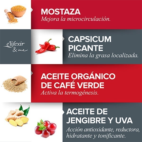 Formulado com Mostarda e Capsicum picante, que ativam a circulação para uma maior eficácia e aumentam a termogênese potencializando a eliminação da gordura localizada, Além disso, contém óleo de Café Verde que mantém e estimula a energia celular para assegurar resultados visíveis em 7 dias.
