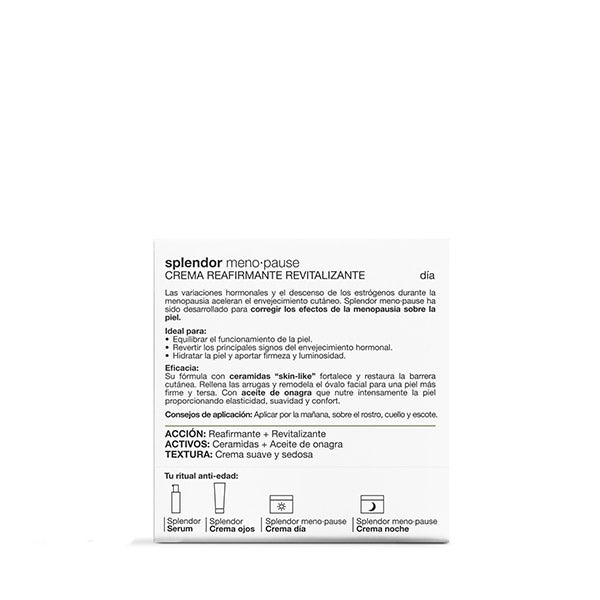 Aplicação: Aplicar pela manhã no rosto, pescoço e decote com a pele limpa ou após o sérum, realizando uma suave massagem até sua completa absorção. À noite aplicar splendor meno·pause noite.