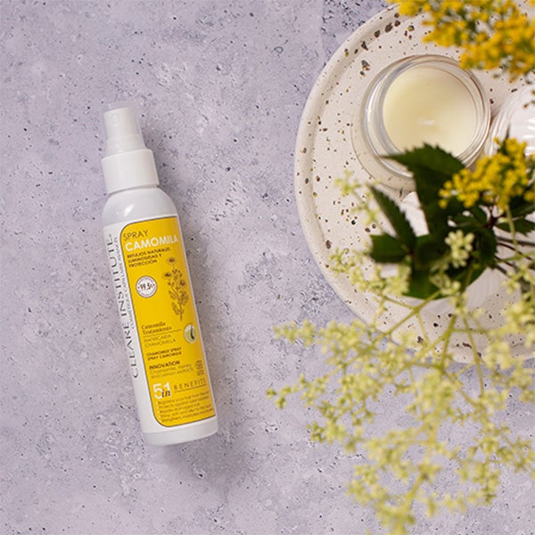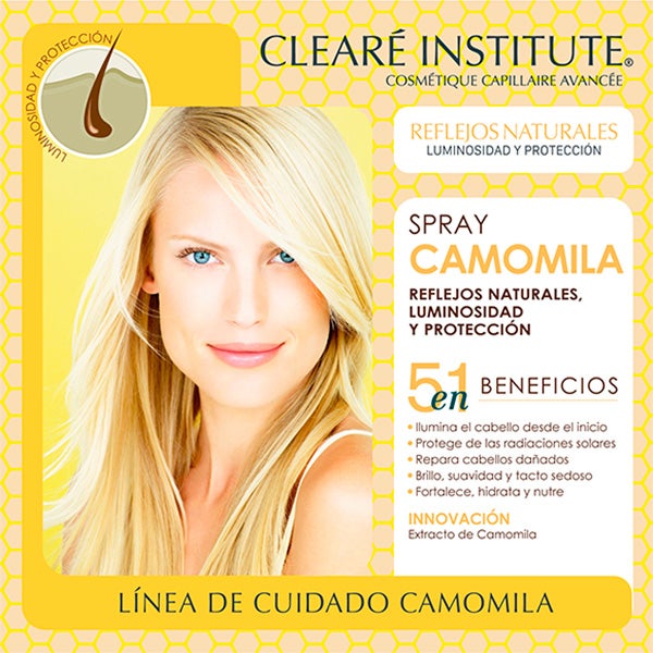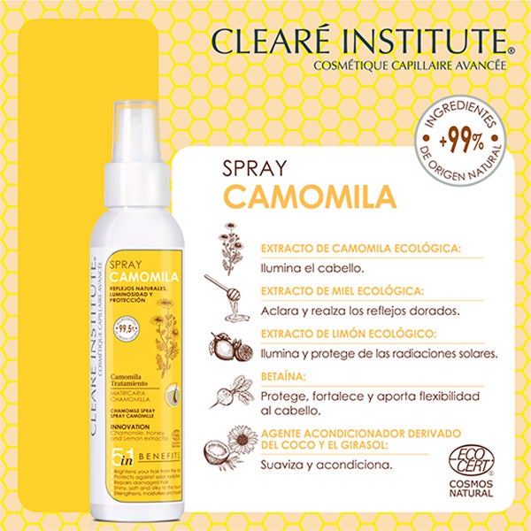 O Spray Camomila do Clearé Institute é um tratamento progressivo que clareia o cabelo proporcionando reflexos dourados naturais que farão ressaltar toda a beleza do seu cabelo enquanto o protege do sol. Combina 3 extratos botânicos ECO que atuam clareando e protegendo o cabelo desde o interior até a superfície.