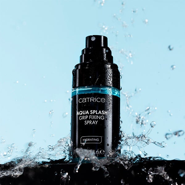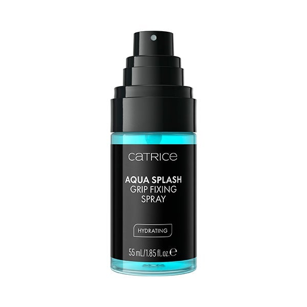 Fixe seu look com o spray fixador Catrice Aqua Splash Grip em um vibrante tom azul.