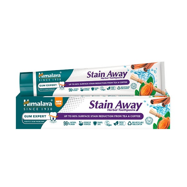A pasta dentifrícia Stain-Away à base de ervas tem uma formulação inovadora com tecnologia baseada em enzimas de plantas como a mamão e o abacaxi, que elimina as manchas produzidas pelo chá, o café ou o tabaco dos dentes em quatro semanas, deixando-os três tons mais brancos.