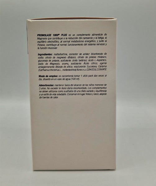 Promolase 1000 Plus é um suplemento alimentar de magnésio e potássio que contribui para a redução do cansaço e da fadiga, para o equilíbrio eletrolítico e para o metabolismo energético normal.