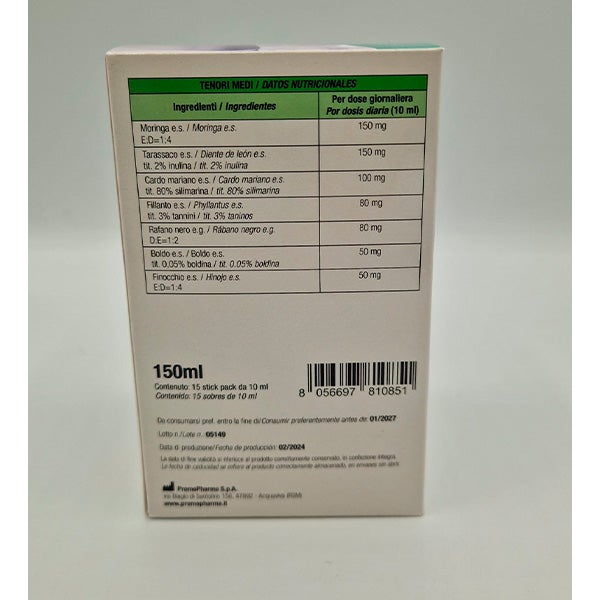 Agua, zumo concentrado de manzana, zumo concentrado de ciruela, Moringa (Moringa oleifera Lam., hojas) d.e. E:D=1:4, Diente de león (Taraxacum officinale Weber, raíz) d.e. tit. 2% inulina, Cardo mariano (Silybum marianum (L.) Gaertn., frutos) d.e. tit. 80% silimarina, Phyllanthus (Phyllanthus niruri L., flores y hojas) d.e. tit. 3% taninos, Rábano negro (Raphanus sativus var. niger (Mill.), raíz) g.e. D:E=1:2, Boldo (Peumus boldus Molina, hojas) d.e. tit. 0,05% boldina, Hinojo (Foeniculum vulgare Mill, semillas) d.e. E:D=1:4, acidulante: ácido cítrico; conservantes: sorbato potásico, benzoato sódico; edulcorante: glucósidos de esteviol.