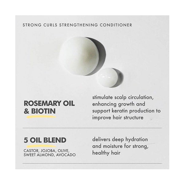 O que é: Um condicionador fortalecedor, rico em biotina, óleo de alecrim e uma mistura de óleos naturais nutritivos que incluem óleo de jojoba, óleo de amêndoas, óleo de abacate, azeite de oliva e extrato de folha de menta para um cabelo mais forte, mais longo e mais saudável. Para quem é: Cachos, ondas e espirais. Para um cabelo mais forte, longo e saudável.