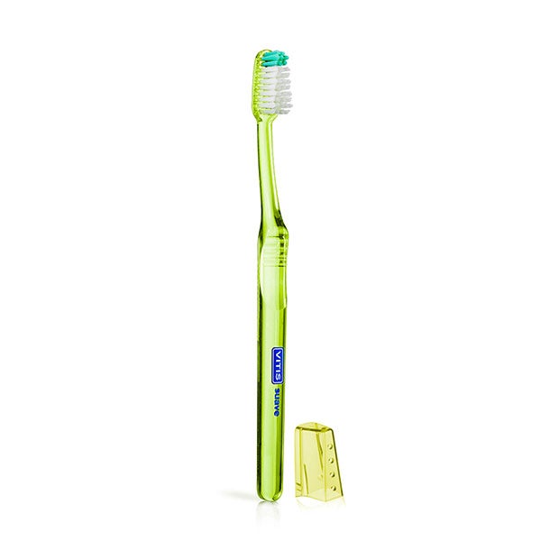 O pescoço da escova é maleável, de modo que pode ser flexionado até adquirir a posição que melhor se adapta à boca, favorecendo assim a acessibilidade durante a escovação. O cabo é anatômico e com ranhuras antiderrapantes para facilitar o uso e conforto durante a escovação.