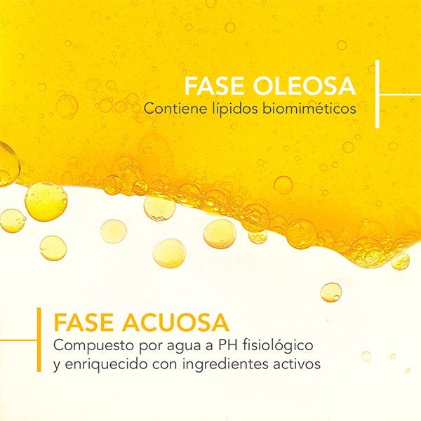 - Protetor solar bifásico com 60% de fase oleosa e 40% de fase aquosa para conseguir uma textura ultraleve e refrescante.