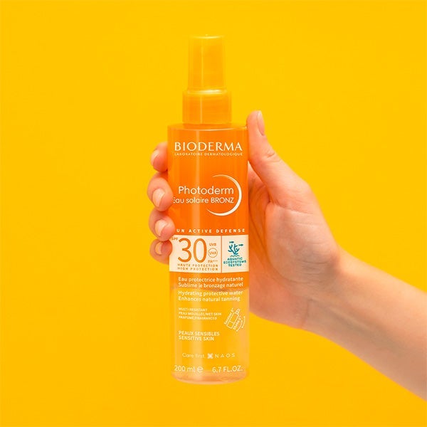 Água solar bronzeadora. Água hidratante corporal que estimula o bronzeado e protege a pele dos raios solares. Com alta proteção solar com SPF30.