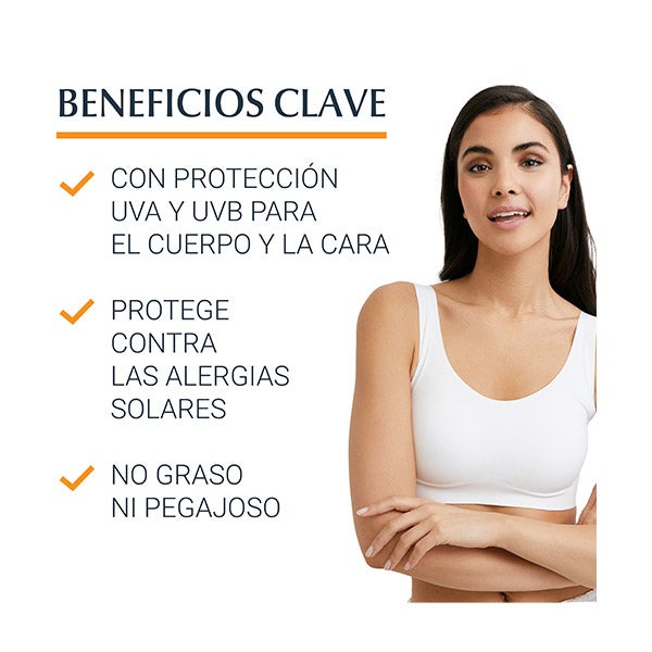 O protetor solar para alergias solares oferece uma proteção muito alta contra raios UV: os filtros contra raios UVA e UVB cumprem os altos padrões definidos pela Cosmetics Europe e os níveis de proteção contra raios UVA superam as recomendações da UE. Com o sistema Advanced Spectral Technology da Eucerin, combina filtros altamente fotoestáveis e de amplo espectro contra raios UVA e UVB, com licocalcona A para neutralizar os radicais livres causados pelos raios UV e a luz HEVL.