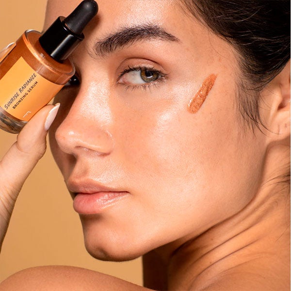 - Com o rosto limpo e bem hidratado, aplique com a pipeta algumas gotas nas áreas que deseja destacar, como as maçãs do rosto ou o osso do nariz, para conseguir um efeito sun kissed.