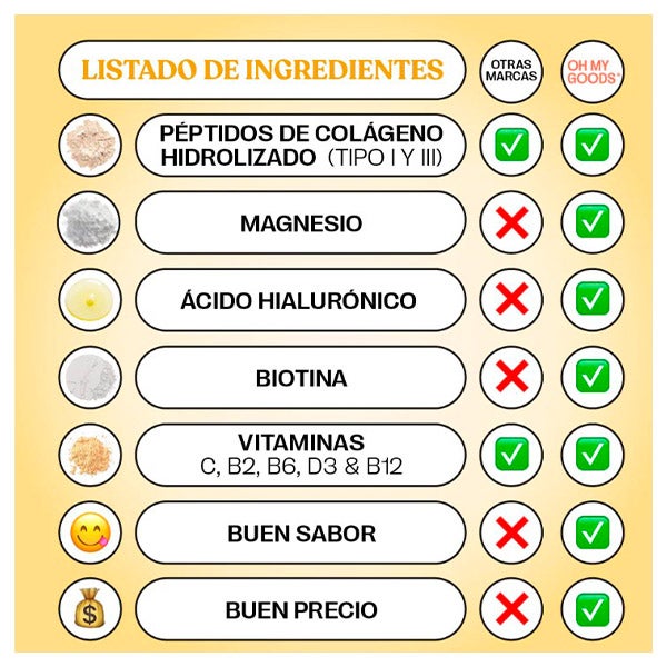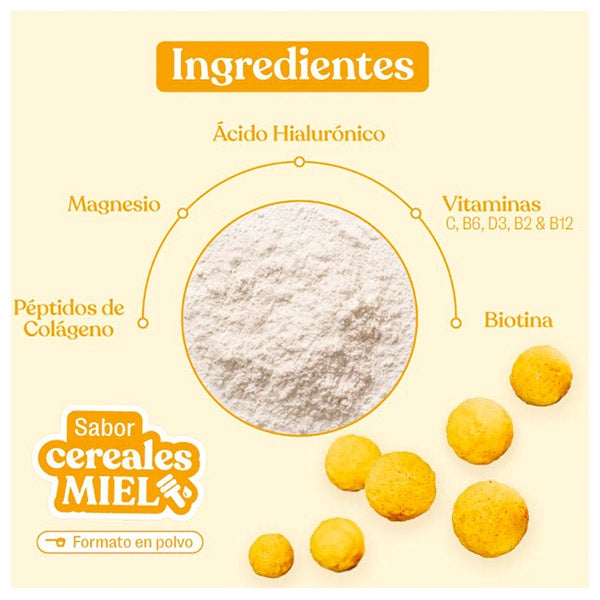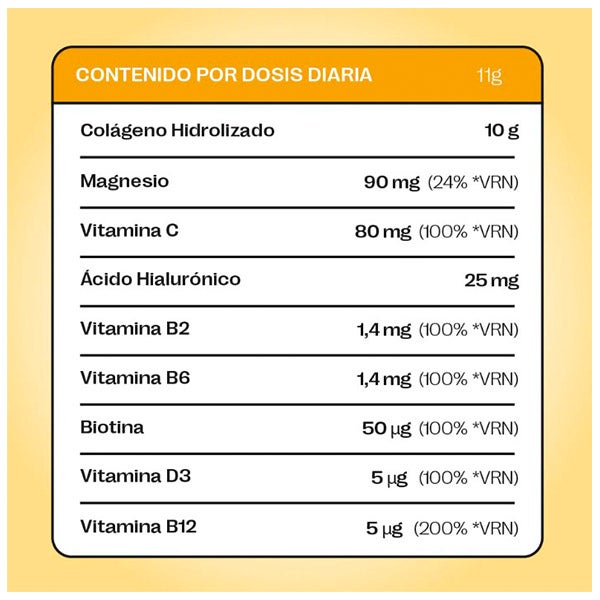 Proteína hidrolizada de colágeno bovino, carbonato de magnesio, vitamina C (L-ascorbato cálcico), ácido hialurónico, vitamina D3 (colecalciferol), vitamina B2 (riboflavina), vitamina B6 (clorhidrato de piridoxina), biotina (D-biotina), vitamina B12 (cianocobalamina), aromas.