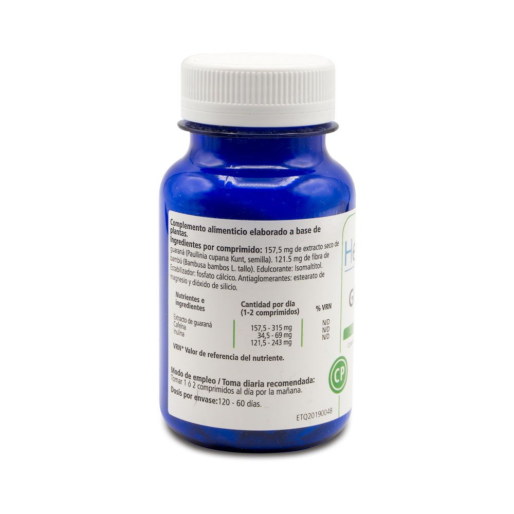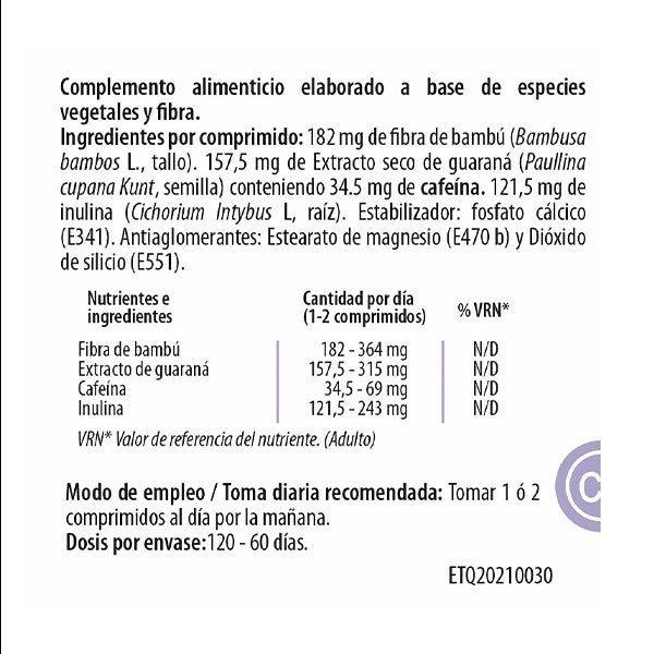 Ingredientes por comprimidos: 182 mg de fibra de bambú (Bambusa bambos L., tallo). 157,5 mg de Extracto seco de guaraná (Paullina cupana Kunt, semilla) contenido 34.5 mg de cafeína. 121.5 mg de inulina (Cichorium Intybus L, raíz). Estabilizador: fosfato cálcico (E341). Antiaglomerantes: Estearato de magnesio (E470 b) y Dióxido de silicio (E551).