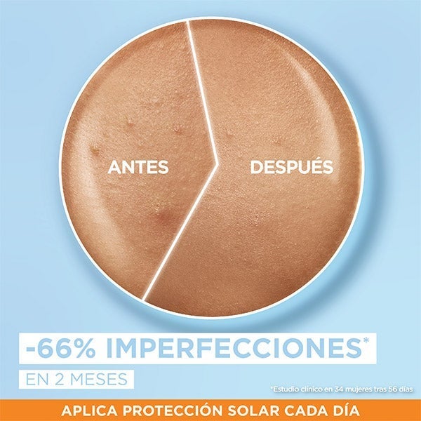 Formulado com 3,5% de [Niacinamida + Ácido Salicílico + PCA de Zinco], este protetor solar foi clinicamente testado** oferecendo resultados notáveis em apenas 2 meses: uma redução de 66% em imperfeições, 55% menos pontos negros e espinhas, 32% menos marcas residuais de acne, 31% menos brilhos na pele e uma diminuição de 31% na visibilidade dos poros. Esta fórmula não comedogênica enquanto você desfruta de uma pele mais suave e uniforme.