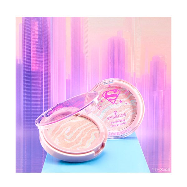 Consiga um visual impecável e radiante com o pó facial embelezador Superman! da Essence. Este pó compacto único apresenta um design de redemoinho em tons pastel de azul, rosa, amarelo e verde, que adicionam um toque divertido à sua rotina de beleza. Com um leve brilho, proporciona um acabamento mate suave que oferece um brilho natural sem parecer opaco. Este pó versátil oferece um rosto suave e uniforme com um toque de luminosidade, exatamente o que você precisa para se sentir pronta para ser uma super-heroína todos os dias.