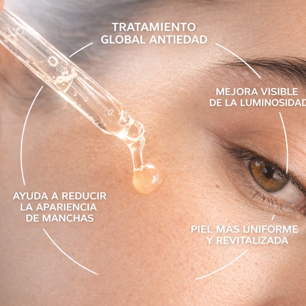 Tratamento global antienvelhecimento. Luminosidade visível. Pele mais uniforme.