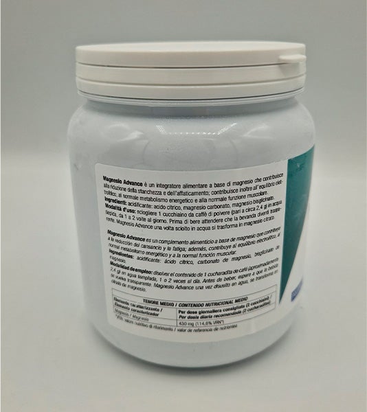 Magnesio Advance 400 é um suplemento alimentar pronto para uso à base de sais de Magnésio que contribui para a redução do cansaço e da fadiga, para o equilíbrio eletrolítico, para o metabolismo energético normal, para o funcionamento normal do sistema nervoso e para a função muscular normal.