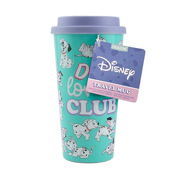 Este copo de viagem reutilizável de plástico dos dálmatas tem um belo acabamento verde e está decorado com filhotes na parte da frente.